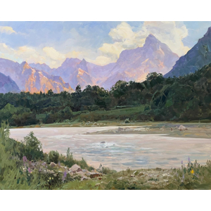 Картина художника Александра Бабича «Тëплый вечер у реки Теберда».