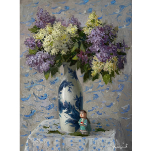 «Букет сирени» Картина цветы сирень в натюрморте художника Юлии Косцовой «Весна». Размер картины 50х60. Картина с цветами написана художником маслом на холсте.